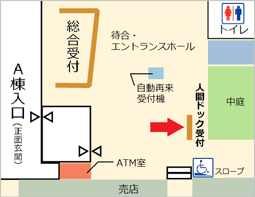正面玄関入口の正面カウンターにて受付をしてください。